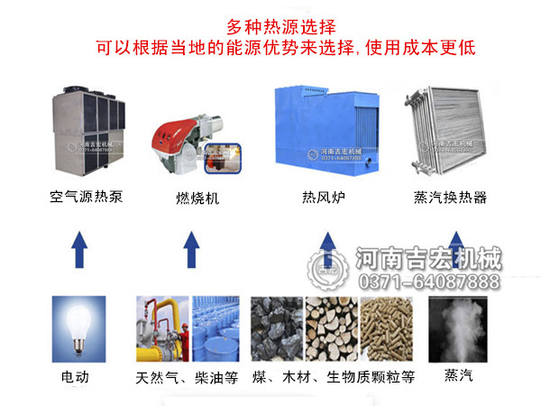 加熱方式:熱源方式可以選燃煤熱風爐、電能、天然氣、熱泵、生物質(zhì)顆粒。
